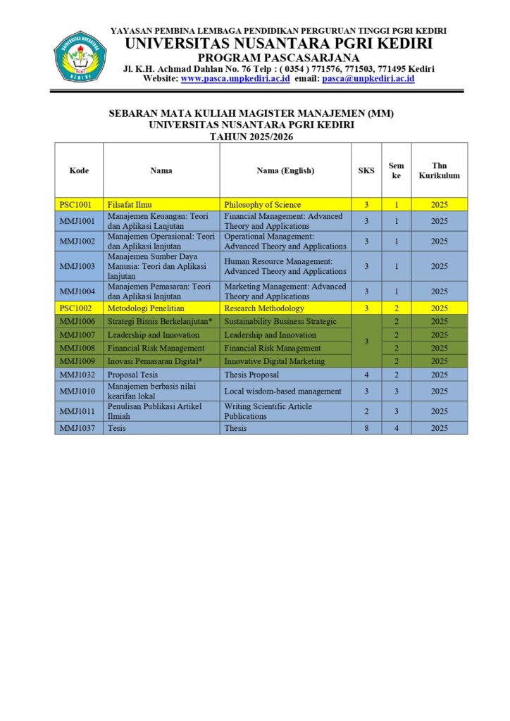 Kurikulum yang diterapkan di Program Studi Magister Manajemen mengacu pada SK Rektor Universitas Nusantara PGRI Kediri No: 1403.01/UN PGRI-Kd/A/VIII/2025 tentang Penetapan Kurikulum Berbasis OBE Periode 2025-2026. Dengan keputusan ini, kami menegaskan komitmen untuk menghasilkan lulusan yang tidak hanya menguasai teori manajemen, tetapi juga dapat mempraktekkan ilmu yang dipelajari di dunia nyata.
