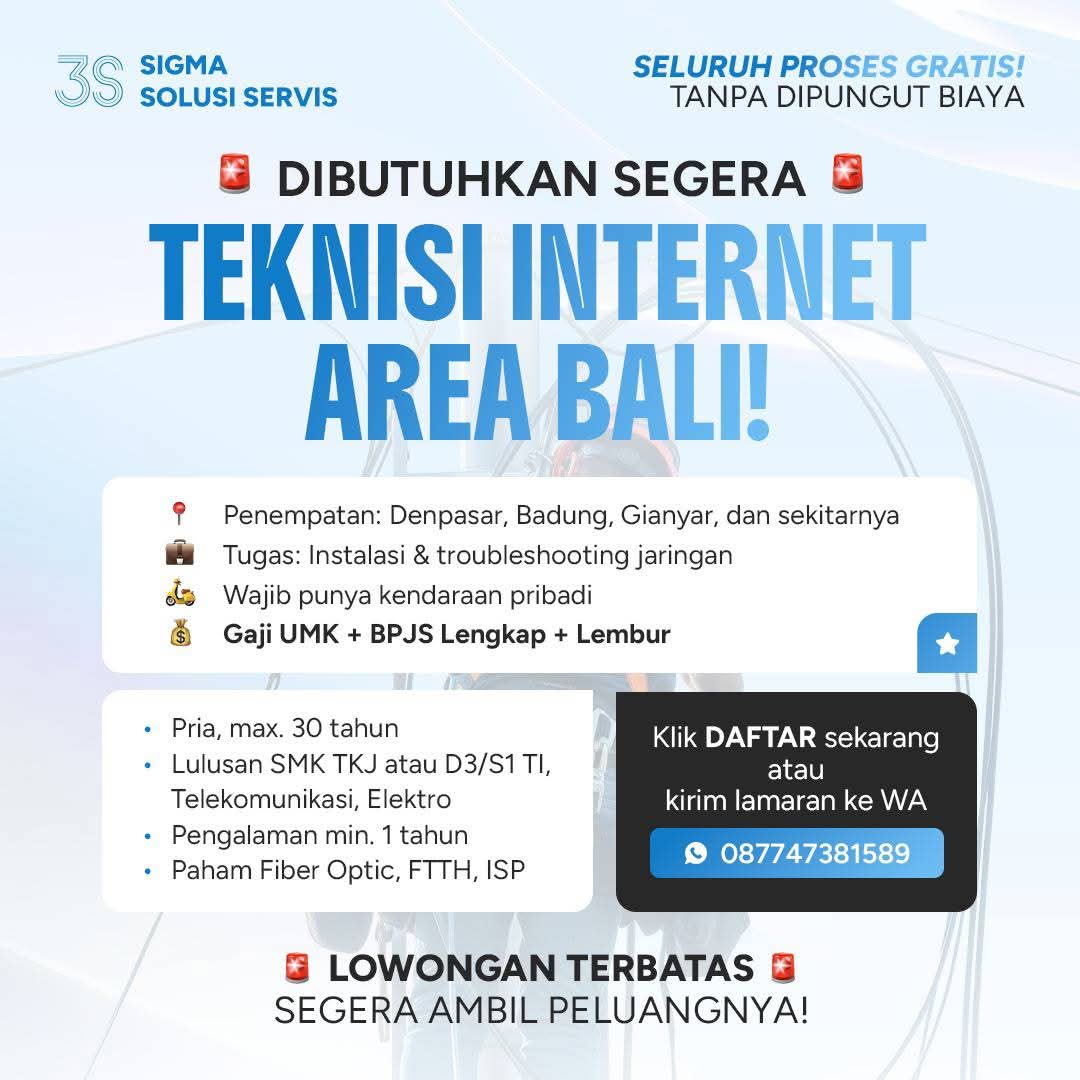 Home » Lowongan Kerja Teknisi Internet Area Bali Lowongan Kerja Teknisi Internet Area Bali July 17, 2025 Post Views: 73 Bagikan: Tags Related Post Lowongan Kerja Sofware Engineer Post Views: 64 July 23, 2025 Lowongan Kerja Staff IT Post Views: 53 July 23, 2025 Lowongan Kerja Customer Servis Post Views: 40 July 23, 2025 Lowongan Kerja Administrasi SMS Finance Post Views: 77 July 17, 2025 Lowongan Kerja Staff Programmer Post Views: 93 July 10, 2025